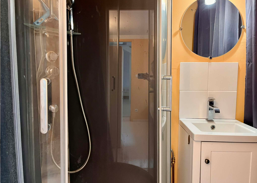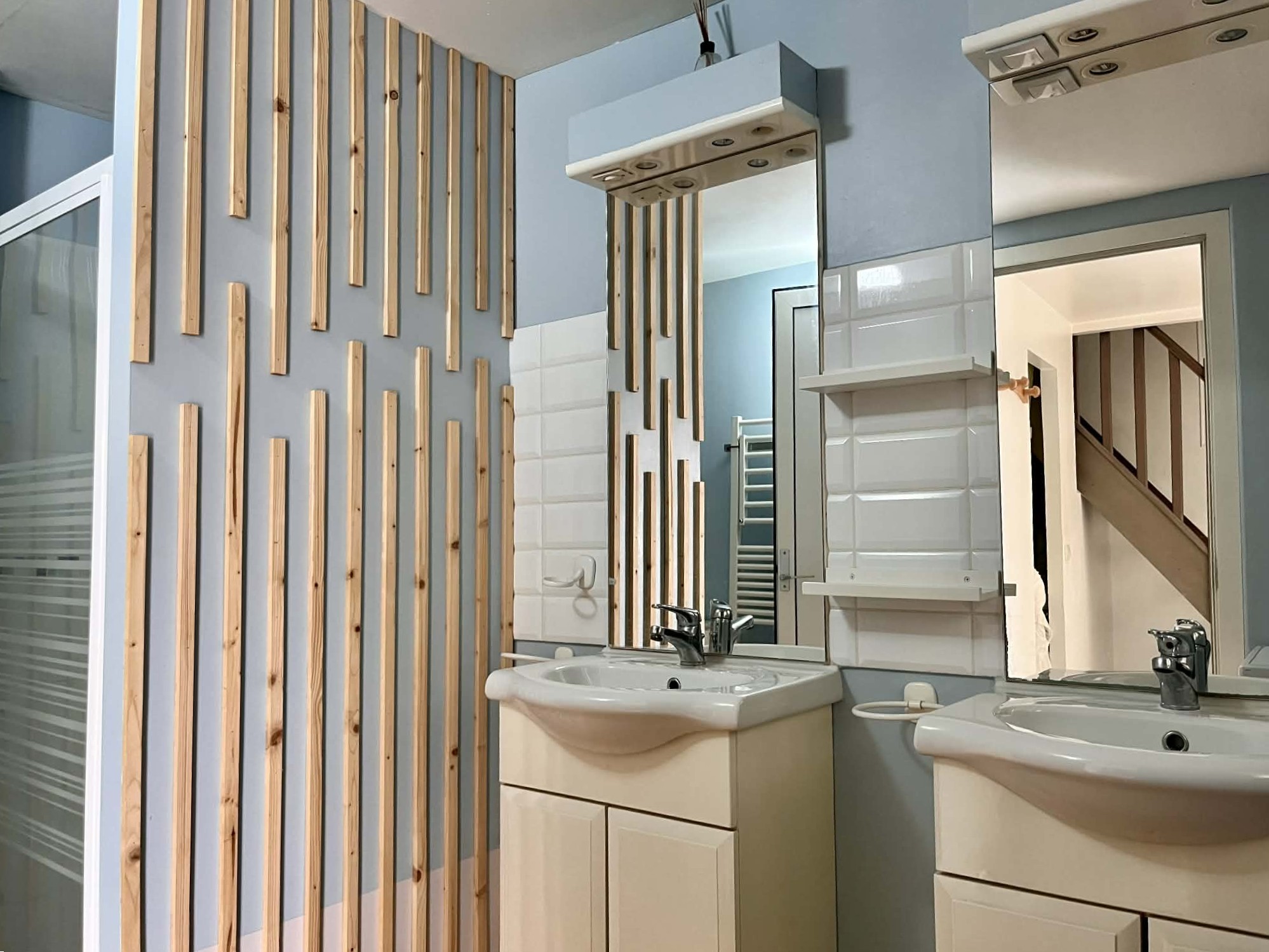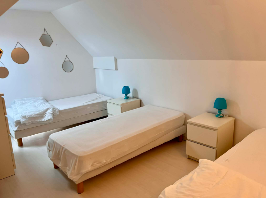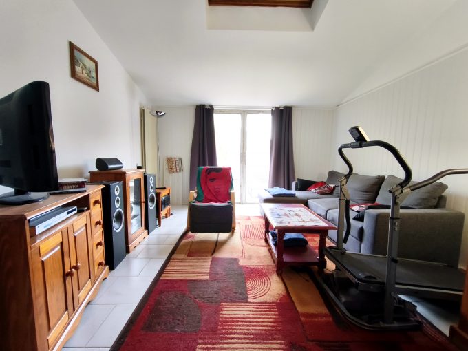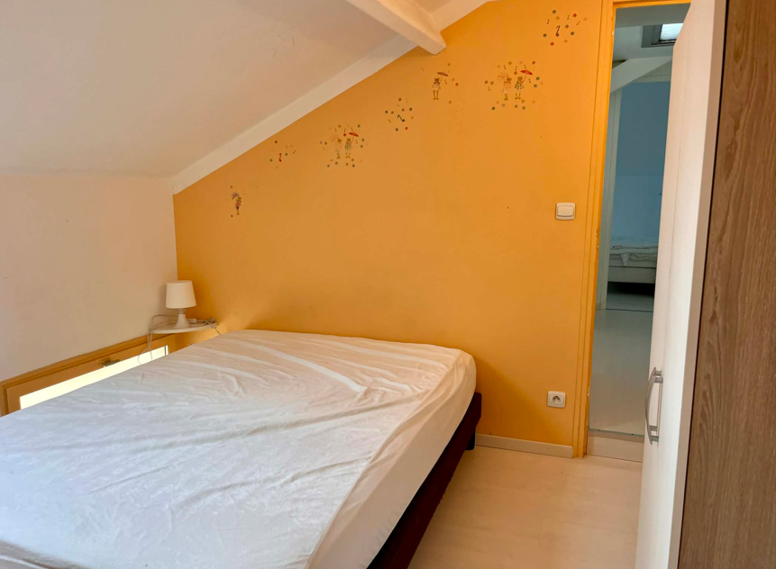 L’étage se compose d’une chambre avec petite salle d’eau, d’une troisième chambre, d’un wc séparé et d’un coin rangement.