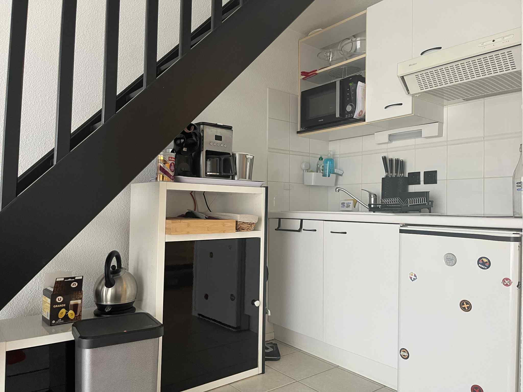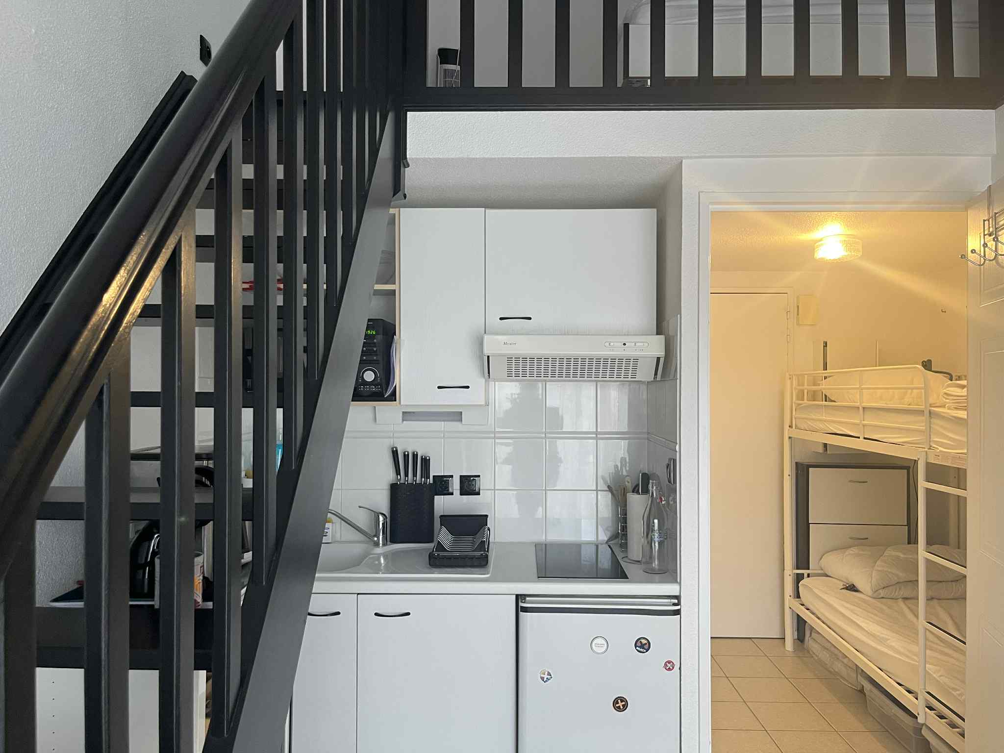 L’appartement se compose d’une entrée avec lit superposé, d’une salle d’eau avec wc, d’une pièce de vie donnant sur le balcon et d’une mezzanine